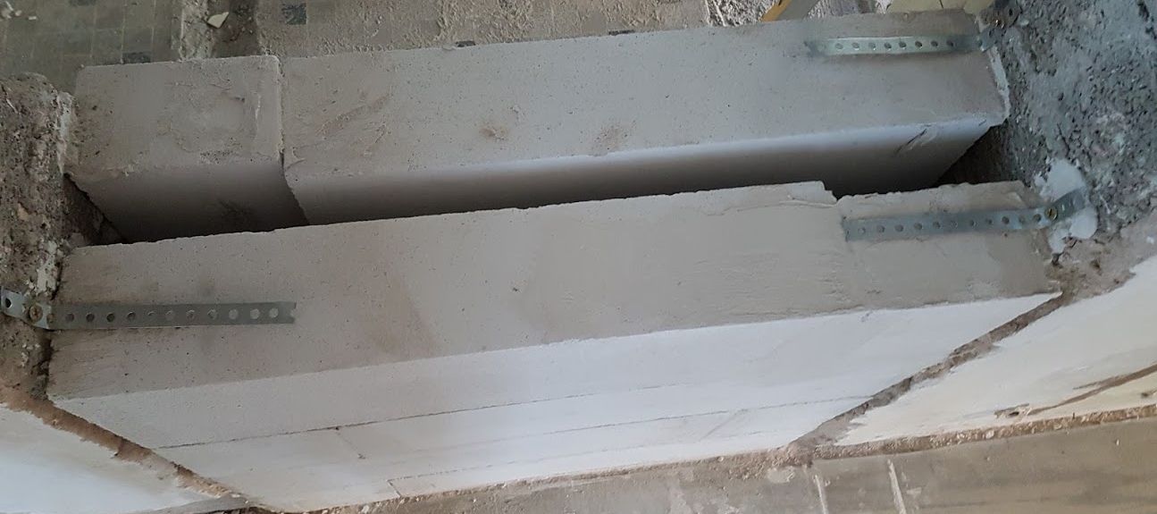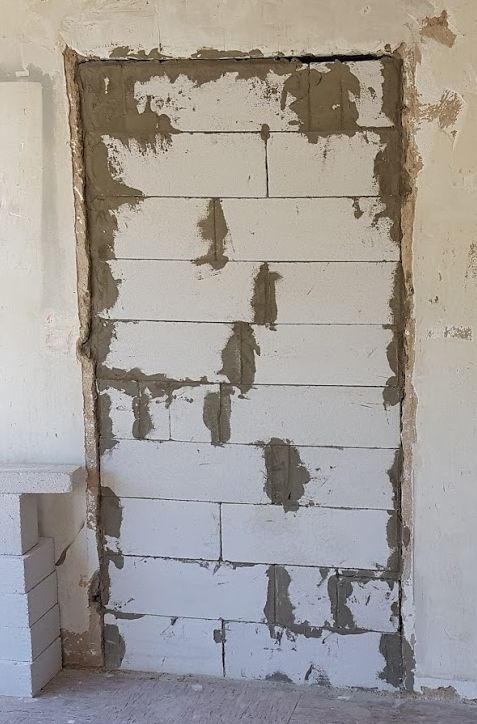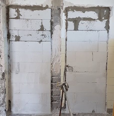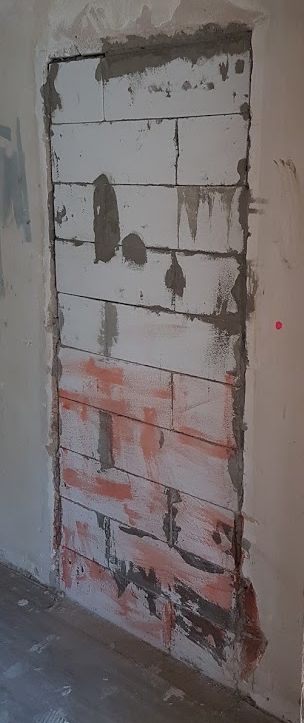 Mehrere ehemalige Türöffnungen wurden nun mit Ytong-Steinen zugemauert. Ich habe das Format 60 x 20 x 11,5 vrwendet. Da es sich um starke, tragende Wände gehandelt hat, wurden die Ytong-Steine zweischalig hochkant eingemauert, an mehreren Stellen mit Mauerankern mit der Wand verbunden und der Zwischenraum mit Beton verfüllt - das hält.