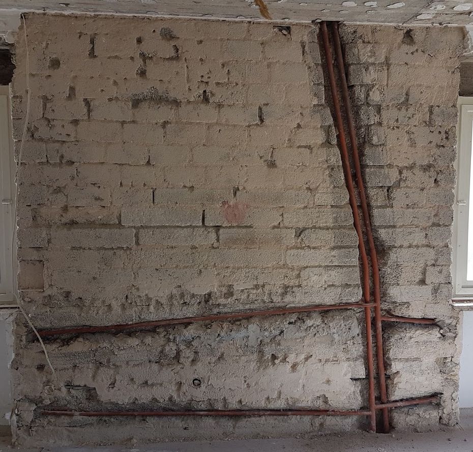 Im ehemaligen Café und neuer Wohnküche im EG musste der Putz an einer Außenwand vollständig abgeschlagen werden. Der Grund war zu sandig und instabil. Interessant sind die alten, mit Rostschutz eingestrichenen Eisen-Heizungsrohre. Die werden nun mit einem Elektro-Schweißgerät abgetrennt. Die neuen Rohre werden isolierte Alu-Verbundrohre sein - Eisen mit ein bisschen eingeputzter Dämmwolle war mal...