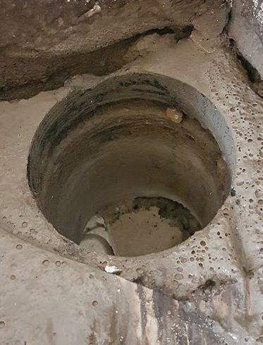Man erkennt von rechts nach links: den Estrich-Boden, dann eine Form von Isolierung - sieht aus wie eine Mischung aus Hanf und Teer, und dann die eigentliche Beton-Zwischengeschossdecke.