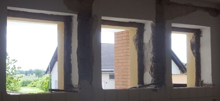 Zuletzt wurden die alten Steinfensterbänke entfernt und die entstandenen Maueröffnungen mit Beton verfüllt: