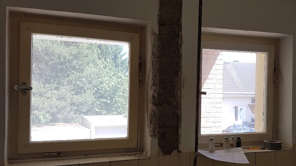 Im EG Badezimmer ist der Plan, die vier vorhandenen Fenster auszubauen, jeweils zwei davon zusammenzulegen, und zwei neue Fenster einzubauen: