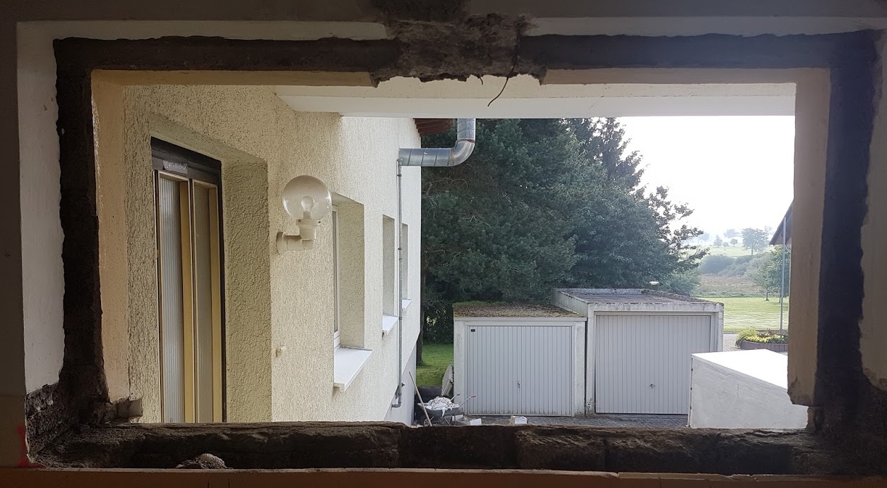 Nach erfolgreicher Prüfung wurden dann zwischen je zwei Fenstern die Mauer-Stege weggebrochen: statisch einwanfrei möglich, da sich darüber ein Beton-Ringanker befindet: