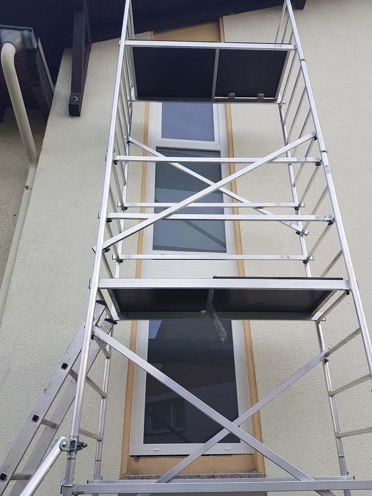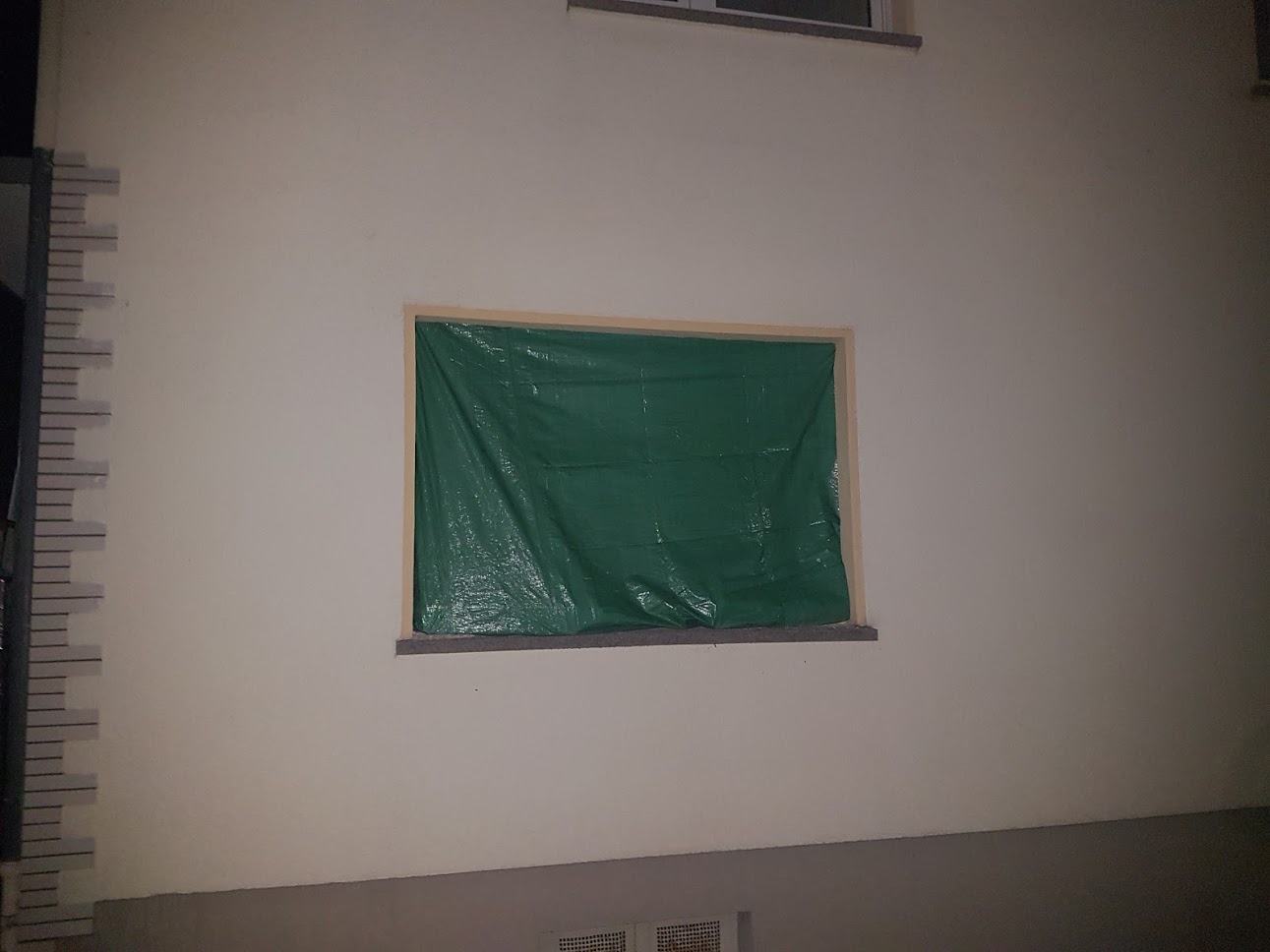 Alle Fenster im Erdgeschoss, sowie eine Balkontür und ein Fenster im Obergeschoss müssen ausgetauscht werden. Dabei werden im EG alle Fenster mit neuen, integrierten Jalousiekästen ausgerüstet. Dazu werden sämtliche Jalousien im EG und OG durch neue mit elektrischen Rohrmotoren ersetzt. Im Treppenhaus werden zusätzlich die alten Glasbausteine durch neue Fensterelemente ersetzt. Ausbau der alten Fenster habe ich selbst übernommen. Säbelsäge und nettem Kollegen sei Dank, war das am Vorabend erledigt und die Fensteröffnungen provisorisch mit Bauplane verschlossen. Nur der Ausbau der Glasbausteine war furchtbar...