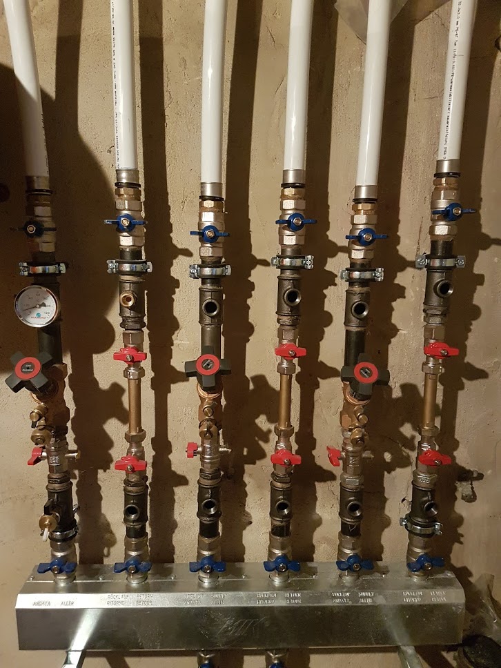 Im Heizungsraum geht es auch ordentlich voran. Die drei Heizkreise sind nun komplett verlegt: alle Heizkörper im EG und OG sind angeschlossen und aktiv. Im "Anbau" ist noch nicht klar, wo später welche Heizkörper benötigt werden - daher ist hier nur ein provisorischer Heizkörper vorhanden. Man sieht auf dem Foto noch ein frühes Stadium mit Platzhaltern für die drei Wärmemengenzähler und noch 5 fehlenden Thermometern. Natürlich sind die Rohre auch noch nicht isoliert: