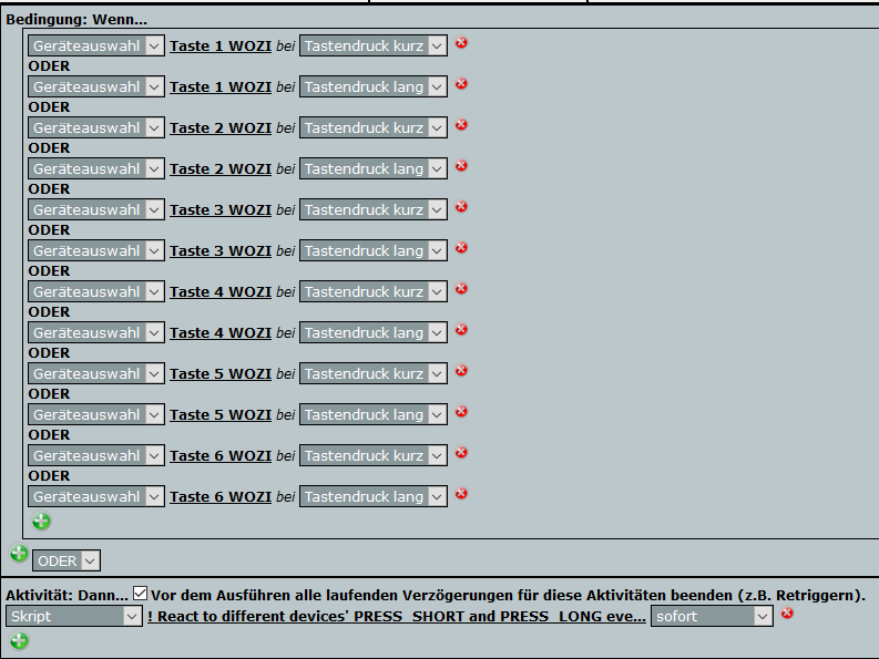 Wenn-Bedingung geht auf eine ODER-Verknüpfung von allen sechs Tasten, sowohl kurz als auch langer Tastendruck, und DANN wird das unten angegebene Script gestartet: